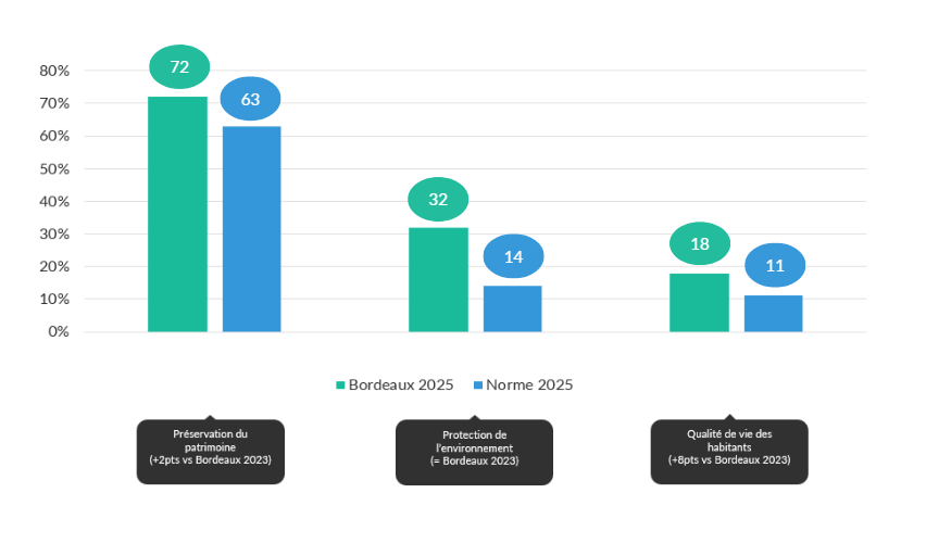 Selon la dernière étude en date de 2025, la métropole bordelaise est perçue comme attractive par 97% de ses résident·e·s : une architecture riche et intéressante, une offre oenotouristique attirante et une situation géographique favorable.